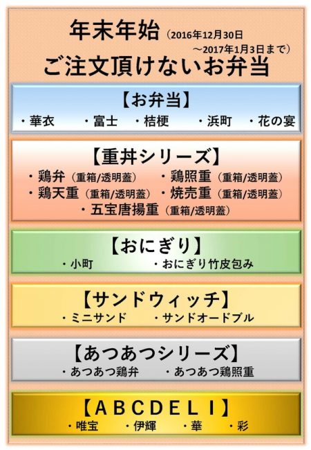 今年も残すところあと一ヶ月になりました。 今年中、えび寿屋の二段弁当(鶏そぼろ二段弁当・特製から揚げ弁当)をご愛好いただきました お客様におかれましては誠に有難う御座います。 今年もクリスマス、大晦日、そしてお正月と忙し […]